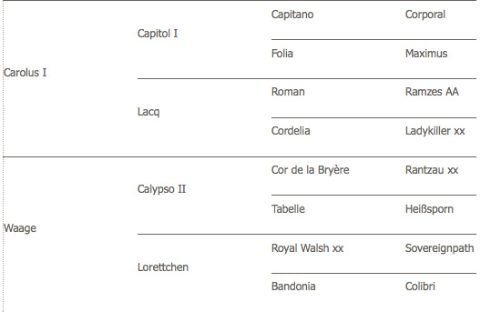 Sire Carolus was successful at level S. Full brother Carolus II won more than 200,000 Euro in his career. Five direct offspring of dam Waage are successful at S level. The full sister of Clinton, Chica Bay, succeeded at S *** level. She is dam of Levisto, who won his stallion performance test with a total score of 156 points (dressage 150, show jumping 137). Levisto was seventh in the World Cup at the Stuttgart Masters. Dam line 4965 provided further the show jumpers Padua with rider Ralf Schneider, Sonora la Silla with Jan Tops and Poor Bay with Beat Mändli.