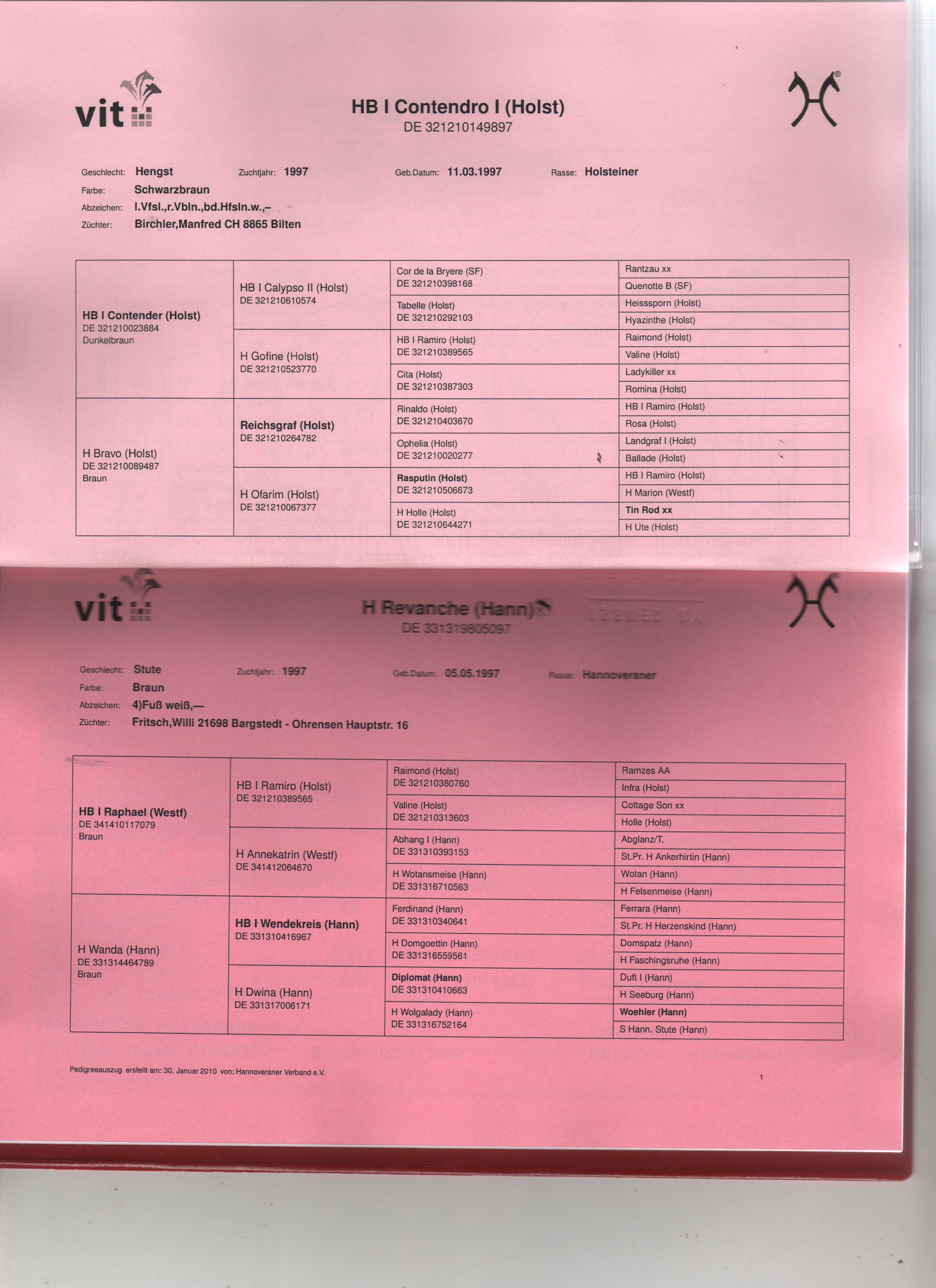 The Swiss Foal Championships in Avenches ended with a Contendro I daughter on second place. Contendro I youngsters have also brought high prices at the Suisse Elite Foal Auction in Frauenfeld. According to their age, Contendro's offspring place in competitions from the bottom level to the very top. His children have spread throughout the world through the auctions in Verden, Vechta and Münster-Handorf, selling to customers from all of Europe and abroad. Contendro's sire, Contender, is one of the Holsteiner Verband's most outstanding sire personalities. The life-time earnings of his off-spring such as the double European Champion, Montender/Marco Kutscher, the two-time Riders Tour winner, Checkmate, and the three-time Derby winner, Collin/Toni Hassmann have run over 3.9 million by 2006. The dam, Bravo, produced another top sire called Caretano Z (by Caretino), who became the 1997 Vice Bundeschampion as well as 1999 World Champion and is meanwhile a successful international sport horse. In 2003 Bravo presented her third licensed son, Contendro II, who became Reserve Champion at his performance test in Adelheidsdorf in 2004 and qualified for the Bundeschampionat in 2006. The granddam, Ofarim, is also the dam of a licensed stallion named Conteur (by Contender), who took fifth place in 2001 and fourth place in 2002 at the Bundeschampionat for riding horses, as well as the sport horses Rainman (by Reichsgraf; Inter I) and Condor (by Campione, a one-star advanced level jumper). Her daughter, Evita XII (by Reichsgraf) is the dam of Caballo (by Coriano), a licensed stallion successful in the US. The Holstein performance line 104 is also known for sires such as Capitano, Carneval, Celano, Chico’s Boy, Corland, Landego and many others as well as the top international horses Retina/Fritz Thiedemann, Athlet and Corlanda/both Willi Melliger/SUI and Athletico/Ludger Beerbaum.